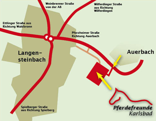 Von der Autobahn (A8) Abfahrt Karlsbad in Richtung Langensteinbach - Ortsmitte im Kreisverkehr Richtung Auerbach und dann kurz vor Auerbach rechts auf die Vereinsanlage (hier ist ein Schild angebracht). Bis bald!